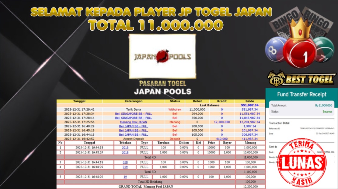 Selamat kepada User id : MAP****** Telah berhasil mendapatkan kemenangan besar pada permainan TOGEL JAPAN dengan total kemenangan Sebesar Rp. 11.000.000,- Setelah mengisi formulir withdraw dengan kurung waktu hanya 5 – 10 menit pihak BESTTOGEL sudah melakukan transfer kepada pemilik Userid dan dana sudah dapat di cairkan oleh pemenang. Bukti pembayaran yang kami berikan merupakan bukti pembayaran yang SAH / VALID yang langung di dapatkan melaui tanda transfer transaksi dari Bank yang di tuju.