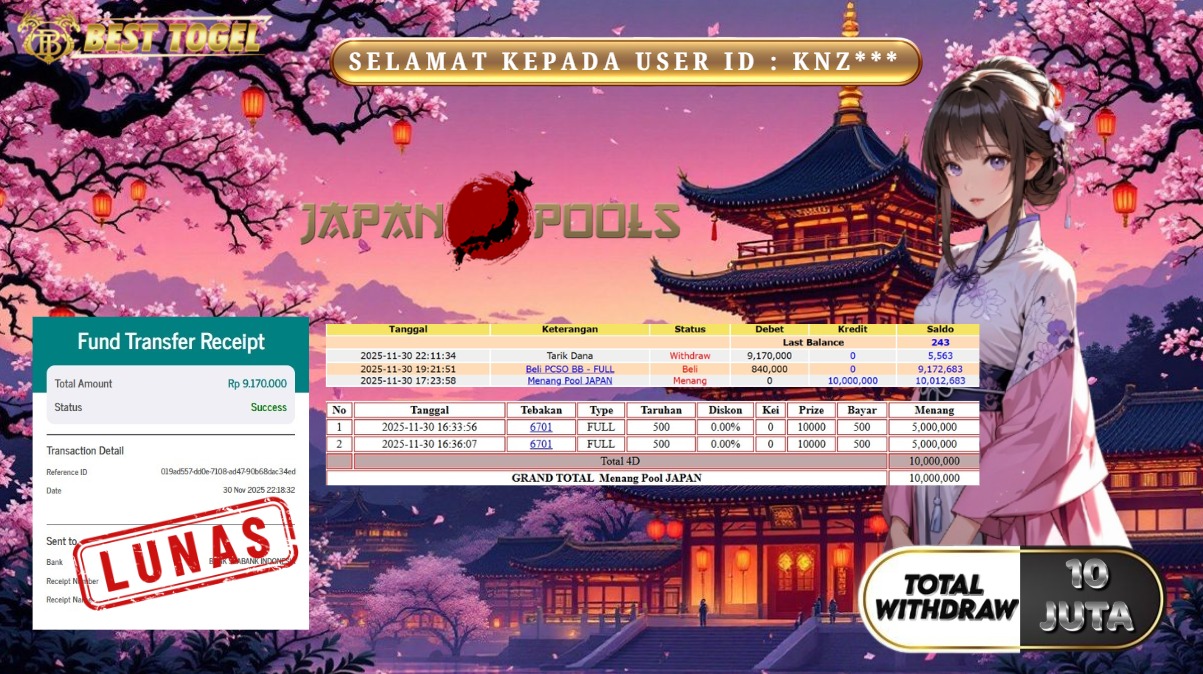 Selamat kepada User id : KNZ****** Telah berhasil mendapatkan kemenangan besar pada permainan TOGEL JEPANG  dengan total kemenangan Sebesar Rp 10.000.000,- Setelah mengisi formulir withdraw dengan kurung waktu hanya 5 – 10 menit pihak  BESTTOGEL sudah melakukan transfer kepada pemilik Userid dan dana sudah dapat di cairkan oleh pemenang. Bukti pembayaran yang kami berikan merupakan bukti pembayaran yang SAH / VALID yang langung di dapatkan melaui tanda transfer transaksi dari Bank yang di tuju.