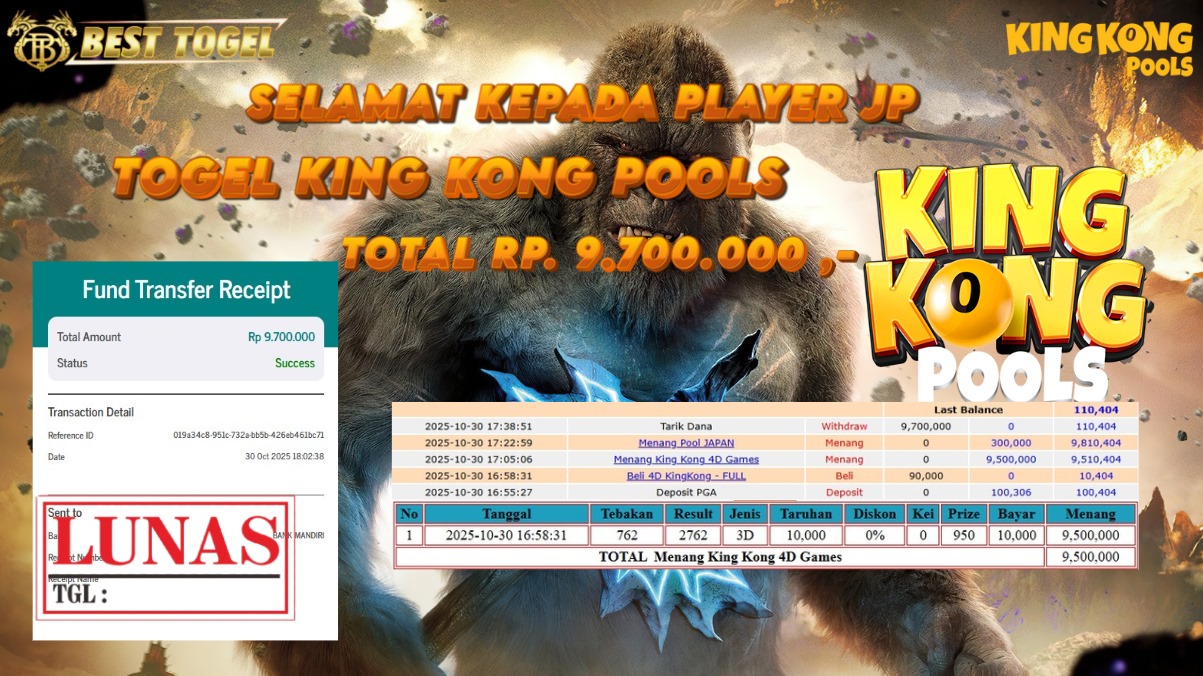 Selamat kepada User id : KHY****** Telah berhasil mendapatkan kemenangan besar pada permainan TOGEL KING KONG POOLS dengan total kemenangan Sebesar Rp 9.700.000 ,- Setelah mengisi formulir withdraw dengan kurung waktu hanya 5 – 10 menit pihak BESTTOGEL sudah melakukan transfer kepada pemilik Userid dan dana sudah dapat di cairkan oleh pemenang. Bukti pembayaran yang kami berikan merupakan bukti pembayaran yang SAH / VALID yang langung di dapatkan melaui tanda transfer transaksi dari Bank yang di tuju.