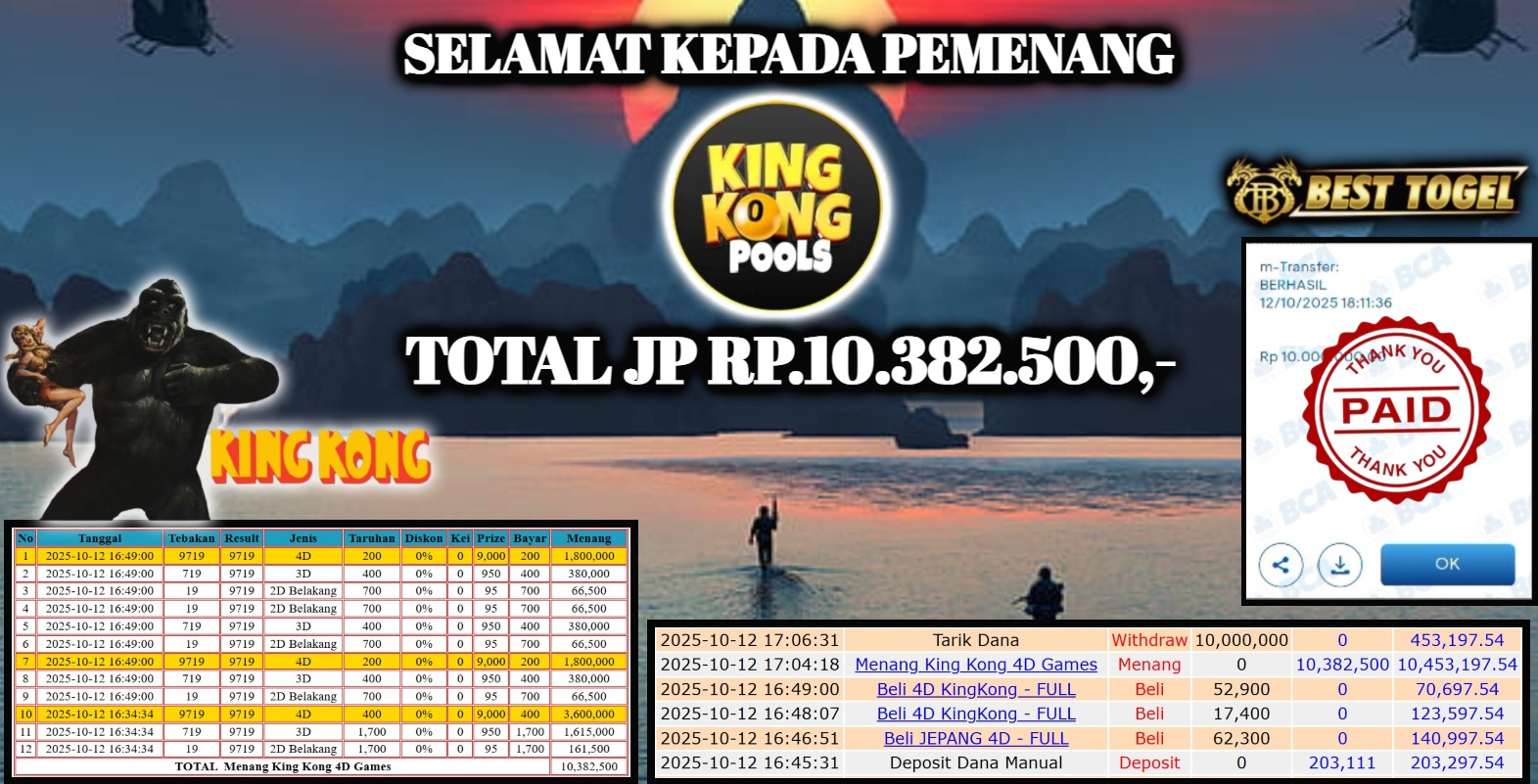 kepada User id : TIG****** Telah berhasil mendapatkan kemenangan besar pada permainan TOGEL KINGKONG POOLS dengan total kemenangan Sebesar Rp. 10.382.500,- Setelah mengisi formulir withdraw dengan kurung waktu hanya 5 – 10 menit pihak BESTTOGEL sudah melakukan transfer kepada pemilik Userid dan dana sudah dapat di cairkan oleh pemenang. Bukti pembayaran yang kami berikan merupakan bukti pembayaran yang SAH / VALID yang langung di dapatkan melaui tanda transfer transaksi dari Bank yang di tuju.