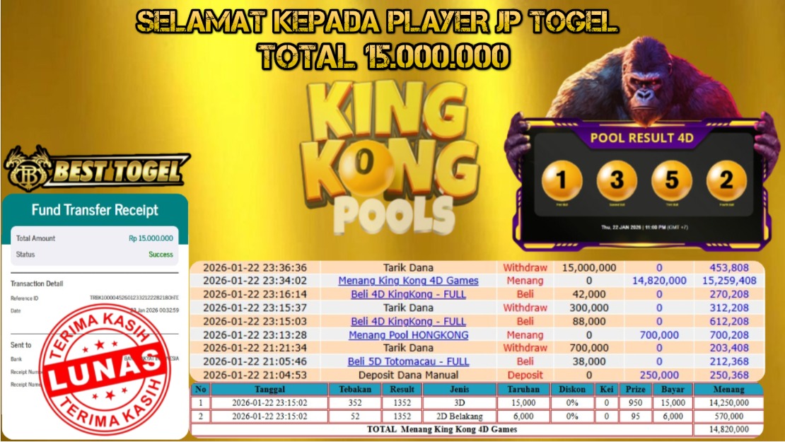 BUKTI JACKPOT TOGEL KINGKONG POOLS RP.15.000.000,- LUNAS