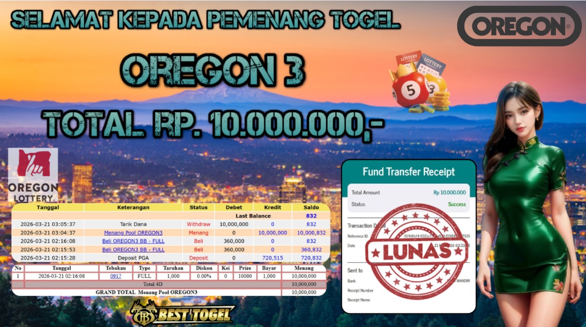 Selamat kepada User id : JAU****** Telah berhasil mendapatkan kemenangan besar pada permainan TOGEL OREGON 3 dengan total kemenangan Sebesar Rp.10.000.000,– Setelah mengisi formulir withdraw dengan kurung waktu hanya 5 – 10 menit pihak BESTTOGEL sudah melakukan transfer kepada pemilik Userid dan dana sudah dapat di cairkan oleh pemenang. Bukti pembayaran yang kami berikan merupakan bukti pembayaran yang SAH / VALID yang langung di dapatkan melaui tanda transfer transaksi dari Bank yang di tuju.