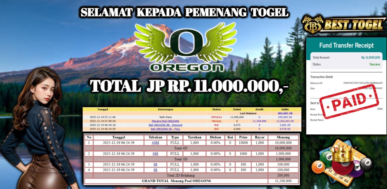 Selamat kepada User id : TEB****** Telah berhasil mendapatkan kemenangan besar pada permainan TOGEL OREGON 6 dengan total kemenangan Sebesar Rp. 11.000.000 ,- Setelah mengisi formulir withdraw dengan kurung waktu hanya 5 – 10 menit pihak BESTTOGEL sudah melakukan transfer kepada pemilik Userid dan dana sudah dapat di cairkan oleh pemenang. Bukti pembayaran yang kami berikan merupakan bukti pembayaran yang SAH / VALID yang langung di dapatkan melaui tanda transfer transaksi dari Bank yang di tuju.