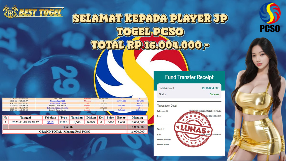 Selamat kepada User id : HSI****** Telah berhasil mendapatkan kemenangan besar pada permainan TOGEL PCSO dengan total kemenangan Sebesar Rp 16.004.000 ,- Setelah mengisi formulir withdraw dengan kurung waktu hanya 5 – 10 menit pihak BESTTOGEL sudah melakukan transfer kepada pemilik Userid dan dana sudah dapat di cairkan oleh pemenang. Bukti pembayaran yang kami berikan merupakan bukti pembayaran yang SAH / VALID yang langung di dapatkan melaui tanda transfer transaksi dari Bank yang di tuju.