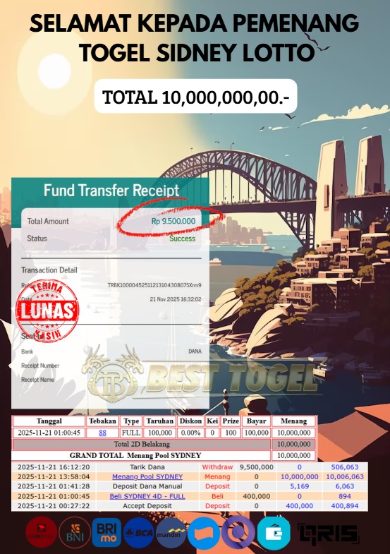 Selamat kepada User id : JOR****** Telah berhasil mendapatkan kemenangan besar pada permainan TOGEL SIDNEY LOTTO dengan total kemenangan Sebesar Rp 10.000.000 ,- Setelah mengisi formulir withdraw dengan kurung waktu hanya 5 – 10 menit pihak BESTTOGEL sudah melakukan transfer kepada pemilik Userid dan dana sudah dapat di cairkan oleh pemenang. Bukti pembayaran yang kami berikan merupakan bukti pembayaran yang SAH / VALID yang langung di dapatkan melaui tanda transfer transaksi dari Bank yang di tuju.