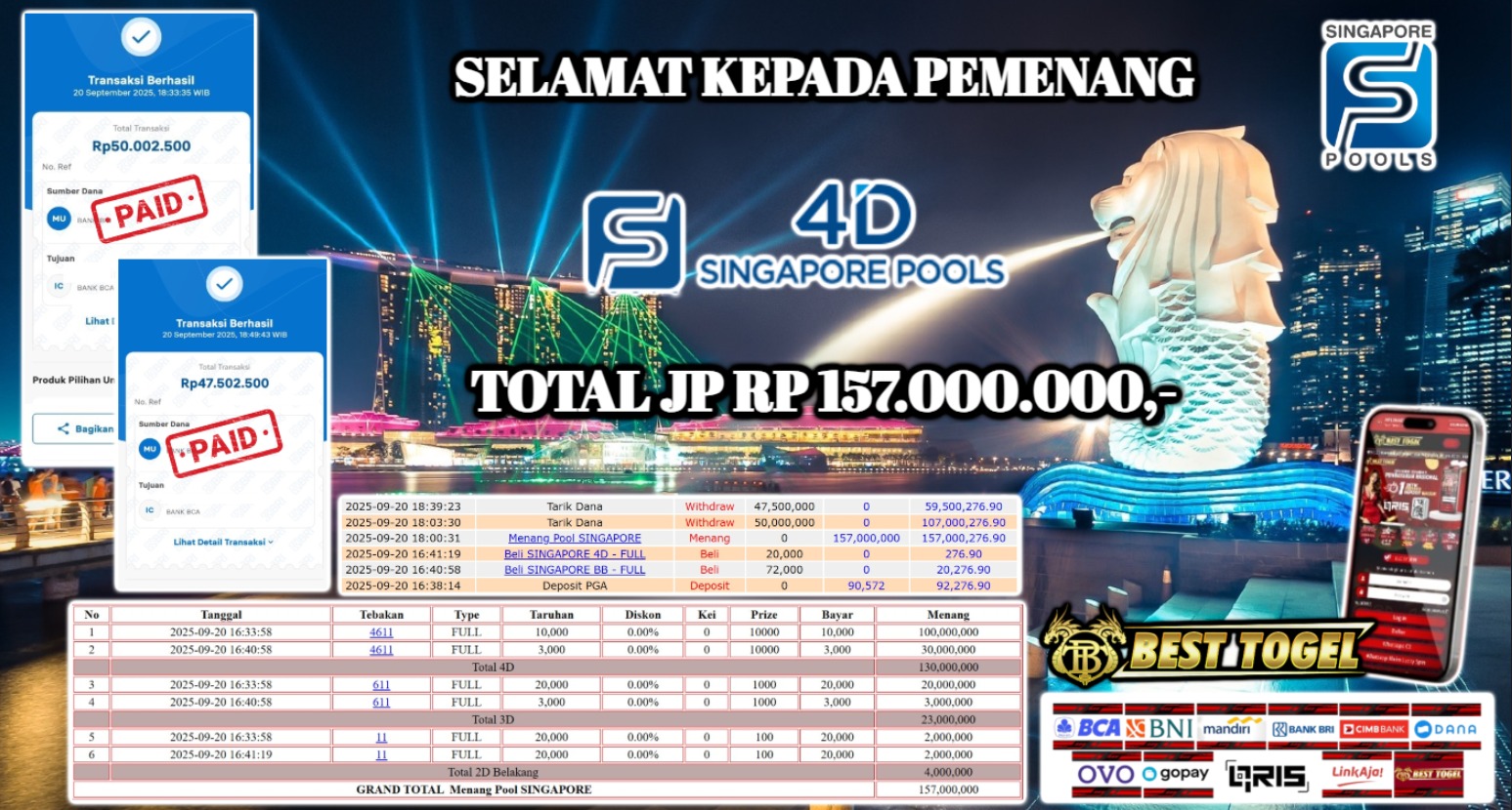 kepada User id : PIT*** Telah berhasil mendapatkan kemenangan besar pada permainan TOGEL SINGAPORE POOLS dengan total kemenangan Sebesar Rp. 157.000.000,- Setelah mengisi formulir withdraw dengan kurung waktu hanya 5 – 10 menit pihak BESTTOGEL sudah melakukan transfer kepada pemilik Userid dan dana sudah dapat di cairkan oleh pemenang. Bukti pembayaran yang kami berikan merupakan bukti pembayaran yang SAH / VALID yang langung di dapatkan melaui tanda transfer transaksi dari Bank yang di tuju.