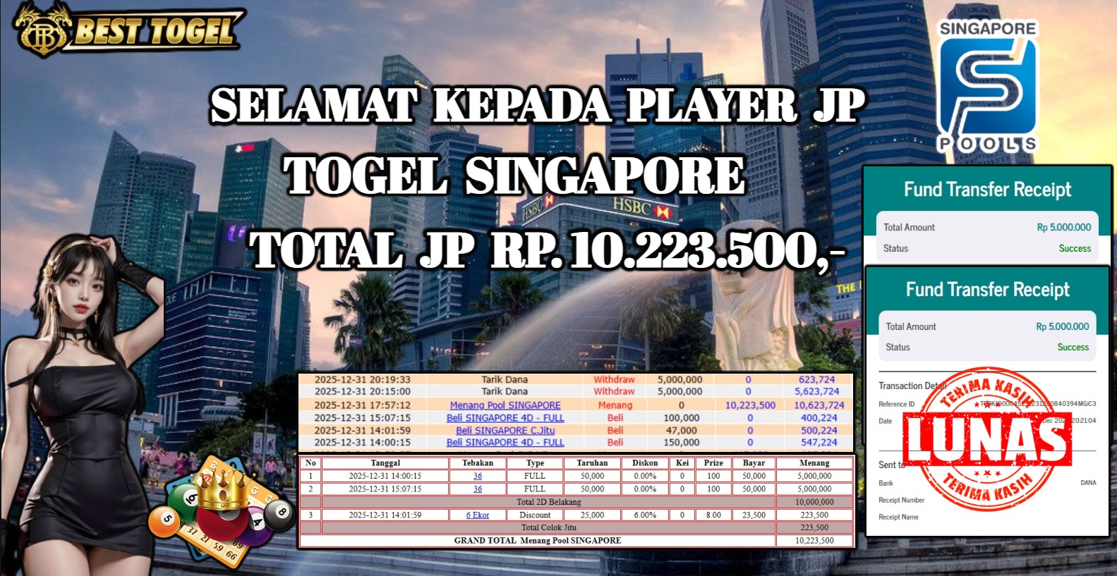 Selamat kepada User id : XIE****** Telah berhasil mendapatkan kemenangan besar pada permainan TOGEL SINGAPORE dengan total kemenangan Sebesar Rp. 10.223.000,- Setelah mengisi formulir withdraw dengan kurung waktu hanya 5 – 10 menit pihak BESTTOGEL sudah melakukan transfer kepada pemilik Userid dan dana sudah dapat di cairkan oleh pemenang. Bukti pembayaran yang kami berikan merupakan bukti pembayaran yang SAH / VALID yang langung di dapatkan melaui tanda transfer transaksi dari Bank yang di tuju.