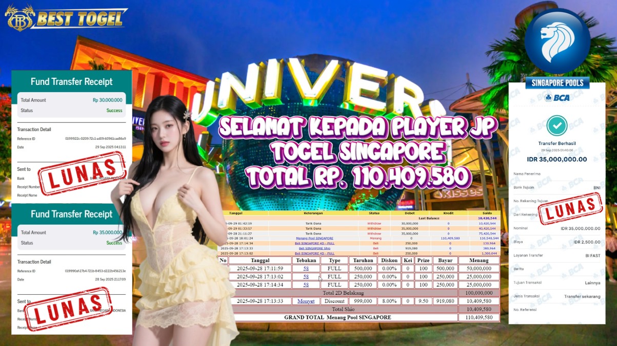 kepada User id : DNF**** Telah berhasil mendapatkan kemenangan besar pada permainan TOGEL SINGAPORE dengan total kemenangan Sebesar Rp. 110.409.580,- Setelah mengisi formulir withdraw dengan kurung waktu hanya 5 – 10 menit pihak BESTTOGEL sudah melakukan transfer kepada pemilik Userid dan dana sudah dapat di cairkan oleh pemenang. Bukti pembayaran yang kami berikan merupakan bukti pembayaran yang SAH / VALID yang langung di dapatkan melaui tanda transfer transaksi dari Bank yang di tuju.