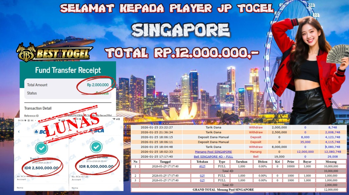 Selamat kepada User id : HAN****** Telah berhasil mendapatkan kemenangan besar pada permainan TOGEL SINGAPORE dengan total kemenangan Sebesar Rp.12.000.000,– Setelah mengisi formulir withdraw dengan kurung waktu hanya 5 – 10 menit pihak BESTTOGEL sudah melakukan transfer kepada pemilik Userid dan dana sudah dapat di cairkan oleh pemenang. Bukti pembayaran yang kami berikan merupakan bukti pembayaran yang SAH / VALID yang langung di dapatkan melaui tanda transfer transaksi dari Bank yang di tuju.