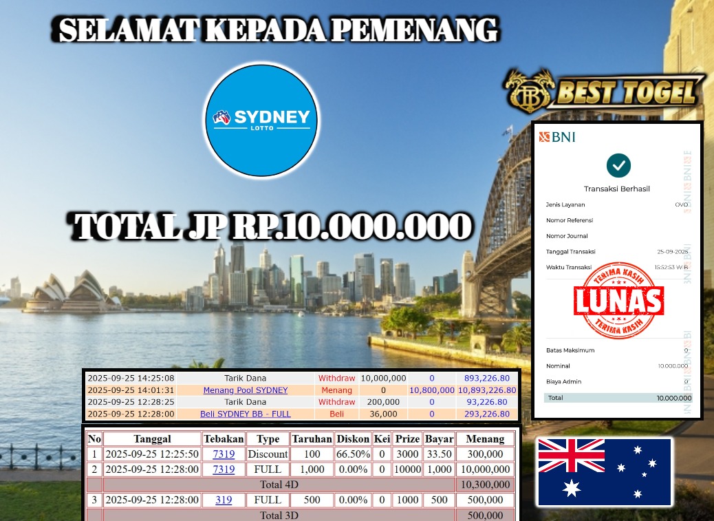 kepada User id : SA****** Telah berhasil mendapatkan kemenangan besar pada permainan TOGEL SYDNEY LOTTO dengan total kemenangan Sebesar Rp. 10.000.000,- Setelah mengisi formulir withdraw dengan kurung waktu hanya 5 – 10 menit pihak BESTTOGEL sudah melakukan transfer kepada pemilik Userid dan dana sudah dapat di cairkan oleh pemenang. Bukti pembayaran yang kami berikan merupakan bukti pembayaran yang SAH / VALID yang langung di dapatkan melaui tanda transfer transaksi dari Bank yang di tuju.