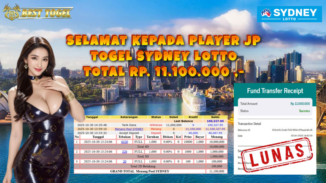 Selamat kepada User id : KPH****** Telah berhasil mendapatkan kemenangan besar pada permainan TOGEL SYDNEY LOTTO dengan total kemenangan Sebesar Rp 11.100.000 ,- Setelah mengisi formulir withdraw dengan kurung waktu hanya 5 – 10 menit pihak BESTTOGEL sudah melakukan transfer kepada pemilik Userid dan dana sudah dapat di cairkan oleh pemenang. Bukti pembayaran yang kami berikan merupakan bukti pembayaran yang SAH / VALID yang langung di dapatkan melaui tanda transfer transaksi dari Bank yang di tuju.