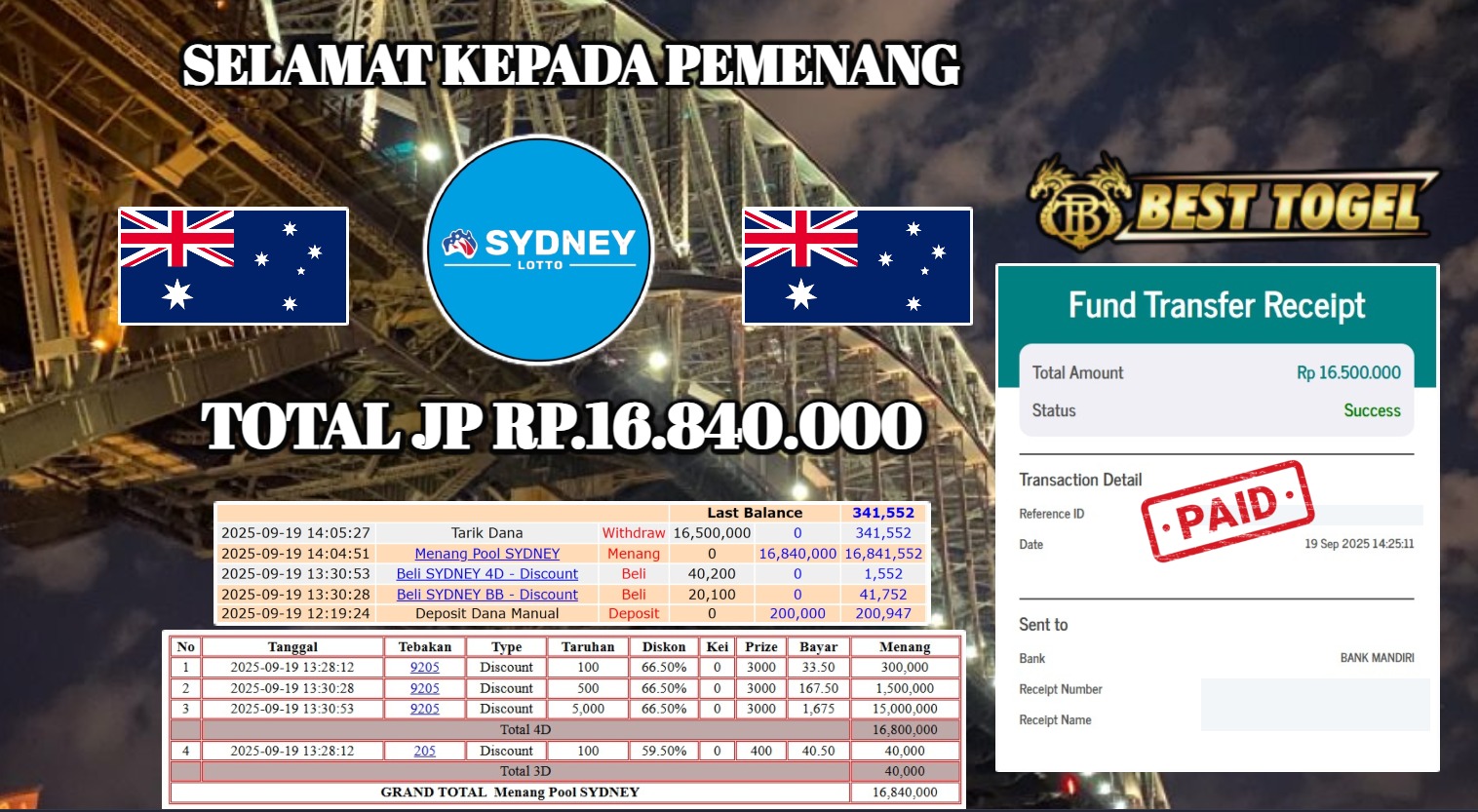 kepada User id : RIK***** Telah berhasil mendapatkan kemenangan besar pada permainan TOGEL LOTTO SYDNEY dengan total kemenangan Sebesar Rp. 16.840.000,- Setelah mengisi formulir withdraw dengan kurung waktu hanya 5 – 10 menit pihak BESTTOGEL sudah melakukan transfer kepada pemilik Userid dan dana sudah dapat di cairkan oleh pemenang. Bukti pembayaran yang kami berikan merupakan bukti pembayaran yang SAH / VALID yang langung di dapatkan melaui tanda transfer transaksi dari Bank yang di tuju.