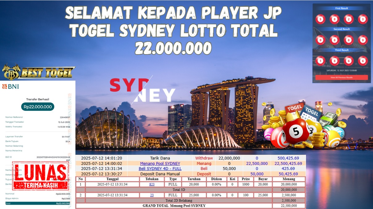 BUKTI JACKPOT TOGEL SYDNEY LOTTO Rp.22.000.000,- LUNAS