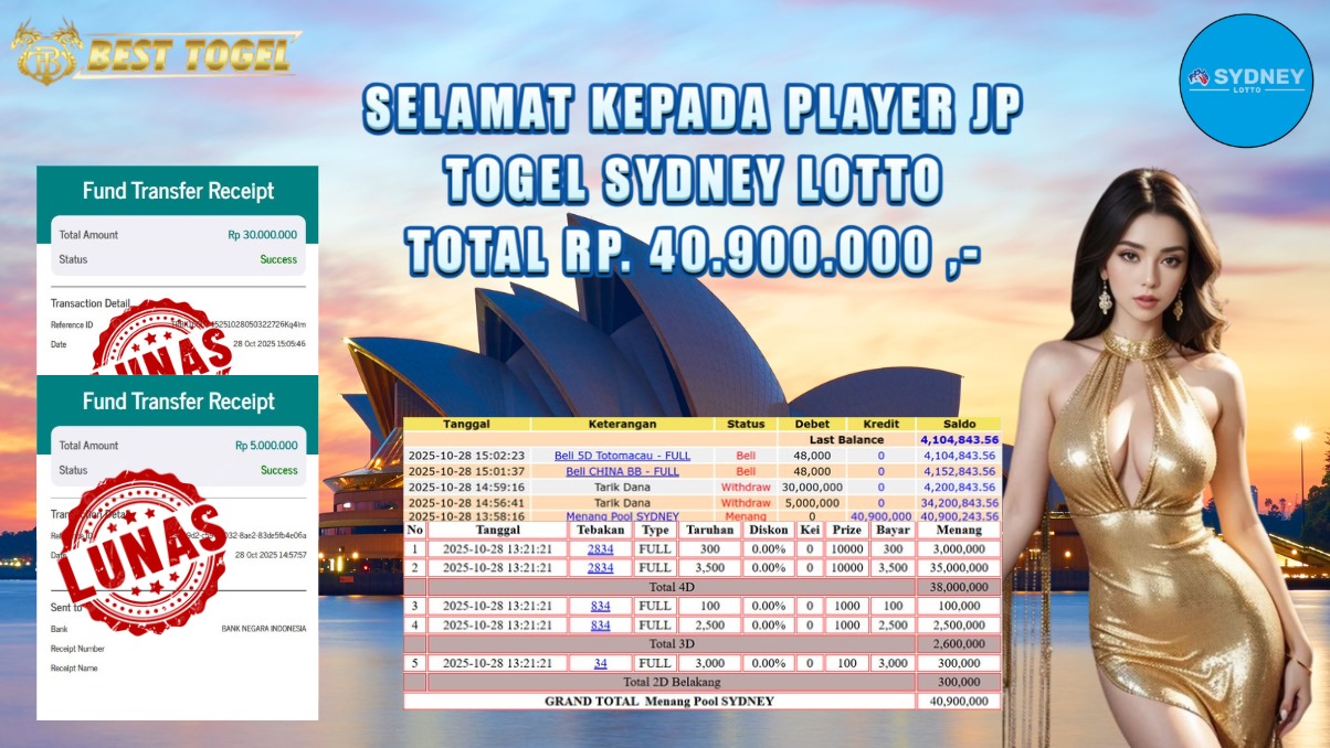 Selamat kepada User id : BRM****** Telah berhasil mendapatkan kemenangan besar pada permainan TOGEL SYDNEY LOTTO dengan total kemenangan Sebesar Rp 40.900.000,- Setelah mengisi formulir withdraw dengan kurung waktu hanya 5 – 10 menit pihak BESTTOGEL sudah melakukan transfer kepada pemilik Userid dan dana sudah dapat di cairkan oleh pemenang. Bukti pembayaran yang kami berikan merupakan bukti pembayaran yang SAH / VALID yang langung di dapatkan melaui tanda transfer transaksi dari Bank yang di tuju.