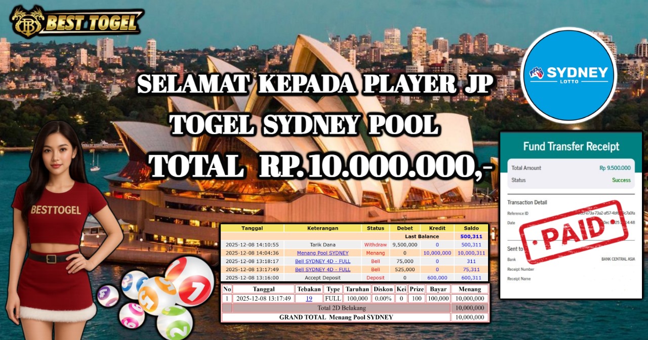 Selamat kepada User id : SYA****** Telah berhasil mendapatkan kemenangan besar pada permainan TOGEL SYDNEY POOL dengan total kemenangan Sebesar Rp. 10.000.000 ,- Setelah mengisi formulir withdraw dengan kurung waktu hanya 5 – 10 menit pihak BESTTOGEL sudah melakukan transfer kepada pemilik Userid dan dana sudah dapat di cairkan oleh pemenang. Bukti pembayaran yang kami berikan merupakan bukti pembayaran yang SAH / VALID yang langung di dapatkan melaui tanda transfer transaksi dari Bank yang di tuju.