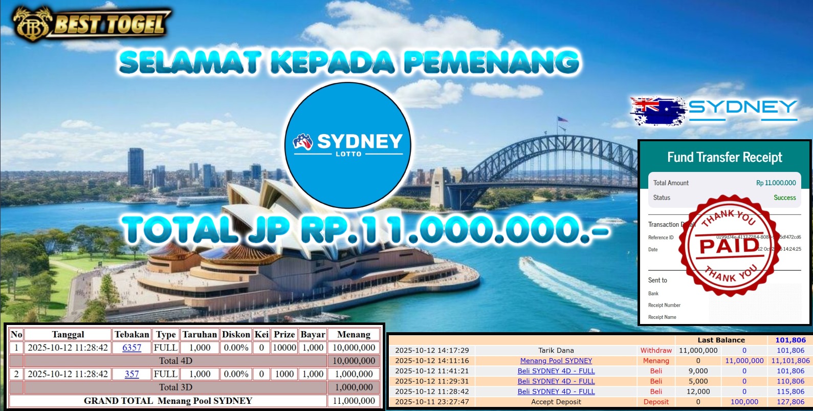 kepada User id : MEM****** Telah berhasil mendapatkan kemenangan besar pada permainan TOGEL SYDNEY POOL dengan total kemenangan Sebesar Rp. 11.000.000,- Setelah mengisi formulir withdraw dengan kurung waktu hanya 5 – 10 menit pihak BESTTOGEL sudah melakukan transfer kepada pemilik Userid dan dana sudah dapat di cairkan oleh pemenang. Bukti pembayaran yang kami berikan merupakan bukti pembayaran yang SAH / VALID yang langung di dapatkan melaui tanda transfer transaksi dari Bank yang di tuju.