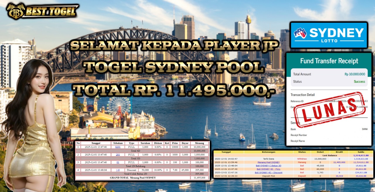 Selamat kepada User id : KLE****** Telah berhasil mendapatkan kemenangan besar pada permainan TOGEL SYDNEY POOL dengan total kemenangan Sebesar Rp 11.495.000,- Setelah mengisi formulir withdraw dengan kurung waktu hanya 5 – 10 menit pihak BESTTOGEL sudah melakukan transfer kepada pemilik Userid dan dana sudah dapat di cairkan oleh pemenang. Bukti pembayaran yang kami berikan merupakan bukti pembayaran yang SAH / VALID yang langung di dapatkan melaui tanda transfer transaksi dari Bank yang di tuju.