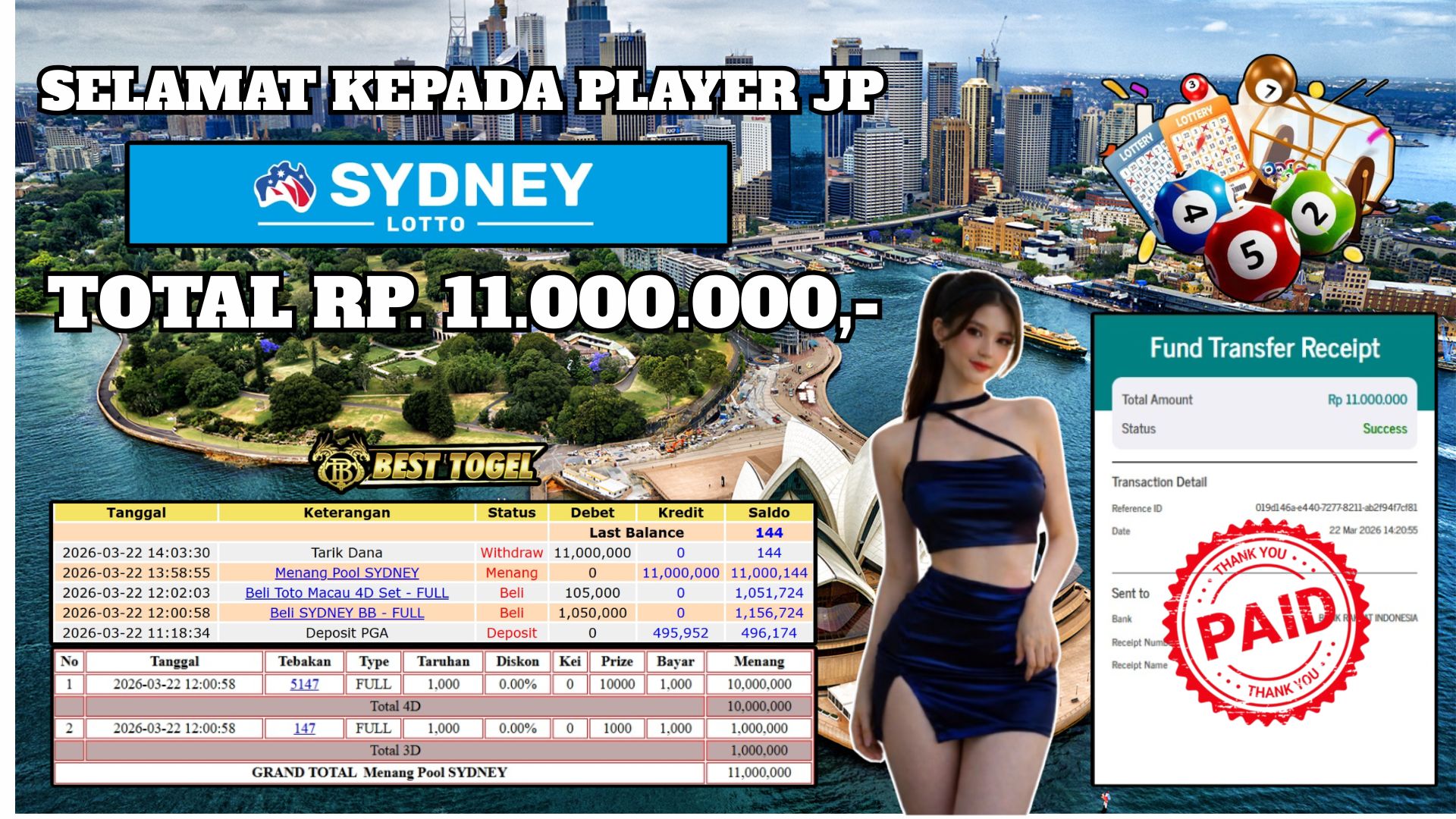 Selamat kepada User id :OD1****** Telah berhasil mendapatkan kemenangan besar pada permainan TOGEL SYDNEY dengan total kemenangan Sebesar Rp.11.000.000,– Setelah mengisi formulir withdraw dengan kurung waktu hanya 5 – 10 menit pihak BESTTOGEL sudah melakukan transfer kepada pemilik Userid dan dana sudah dapat di cairkan oleh pemenang. Bukti pembayaran yang kami berikan merupakan bukti pembayaran yang SAH / VALID yang langung di dapatkan melaui tanda transfer transaksi dari Bank yang di tuju.
