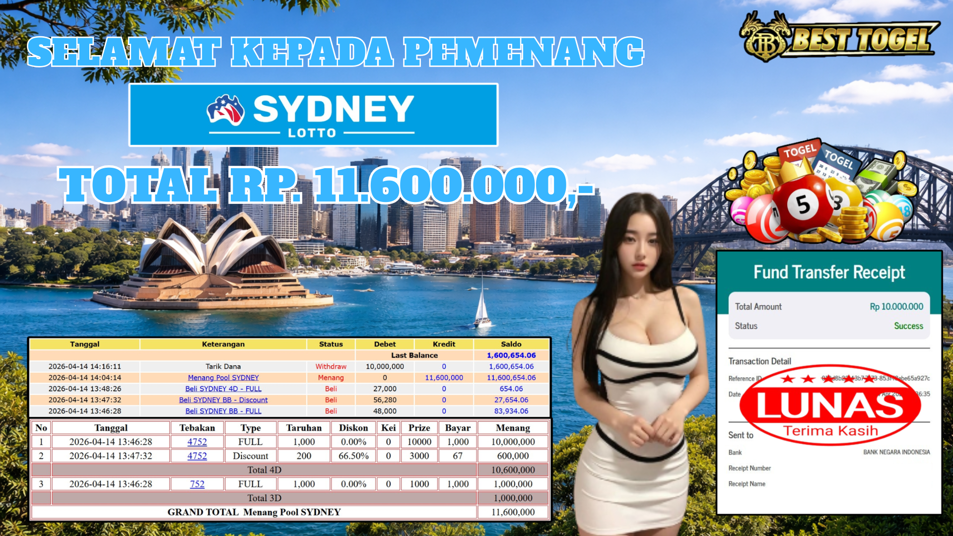 Selamat kepada User id : GLE*** Telah berhasil mendapatkan kemenangan besar pada permainanan TOGEL SYDNEY dengan total kemenangan Sebesar Rp. 11,600,000- Setelah mengisi formulir withdraw dengan kurung waktu hanya 5 – 10 menit pihak BESTTOGEL sudah melakukan transfer kepada pemilik Userid dan dana sudah dapat di cairkan oleh pemenang. Bukti pembayaran yang kami berikan merupakan bukti pembayaran yang SAH / VALID yang langung di dapatkan melaui tanda transfer transaksi dari Bank yang di tuju.Kami mengucapakan banyak Terima Kasih Kepada pemenang karena sudah mempercayakan kami sebagai Bandar Tepercaya yang membayar semua kemenangan member