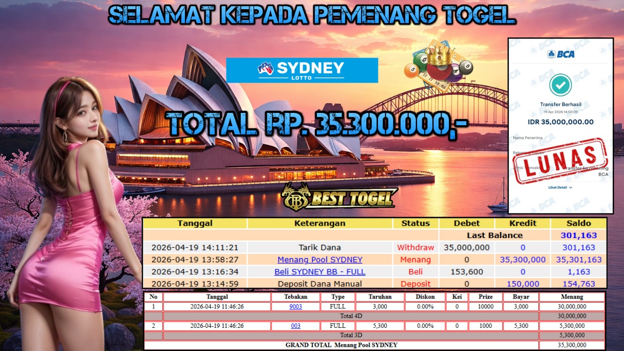 Selamat kepada User id : LEM*** Telah berhasil mendapatkan kemenangan besar pada permainanan TOGEL SYDNEY dengan total kemenangan Sebesar Rp. 35.000.000,- Setelah mengisi formulir withdraw dengan kurung waktu hanya 5 – 10 menit pihak BESTTOGEL sudah melakukan transfer kepada pemilik Userid dan dana sudah dapat di cairkan oleh pemenang. Bukti pembayaran yang kami berikan merupakan bukti pembayaran yang SAH / VALID yang langung di dapatkan melaui tanda transfer transaksi dari Bank yang di tuju.Kami mengucapakan banyak Terima Kasih Kepada pemenang karena sudah mempercayakan kami sebagai Bandar Tepercaya yang membayar semua kemenangan member