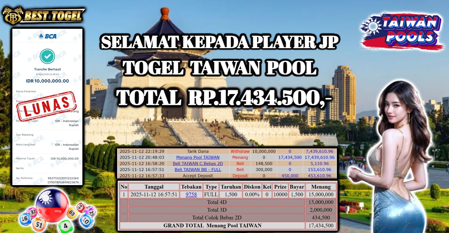 Selamat kepada User id SDL****** Telah berhasil mendapatkan kemenangan besar pada permainan TOGEL TAIWAN LOTTO dengan total kemenangan Sebesar Rp 17.434.500 ,- Setelah mengisi formulir withdraw dengan kurung waktu hanya 5 – 10 menit pihak BESTTOGEL sudah melakukan transfer kepada pemilik Userid dan dana sudah dapat di cairkan oleh pemenang. Bukti pembayaran yang kami berikan merupakan bukti pembayaran yang SAH / VALID yang langung di dapatkan melaui tanda transfer transaksi dari Bank yang di tuju.