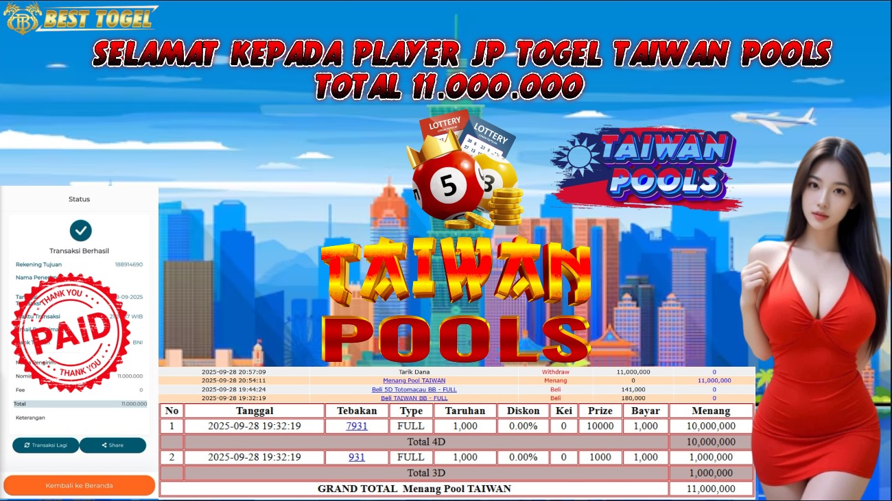 kepada User id : HGO**** Telah berhasil mendapatkan kemenangan besar pada permainan TOGEL TAIWAN POOLS dengan total kemenangan Sebesar Rp. 11.000.000,- Setelah mengisi formulir withdraw dengan kurung waktu hanya 5 – 10 menit pihak BESTTOGEL sudah melakukan transfer kepada pemilik Userid dan dana sudah dapat di cairkan oleh pemenang. Bukti pembayaran yang kami berikan merupakan bukti pembayaran yang SAH / VALID yang langung di dapatkan melaui tanda transfer transaksi dari Bank yang di tuju.