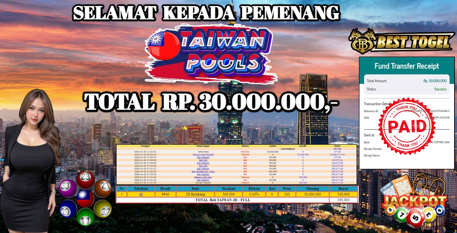 Selamat kepada User id : KVO****** Telah berhasil mendapatkan kemenangan besar pada permainan TOGEL TAIWAN POOLS dengan total kemenangan Sebesar Rp. 30.000.000,- Setelah mengisi formulir withdraw dengan kurung waktu hanya 5 – 10 menit pihak BESTTOGEL sudah melakukan transfer kepada pemilik Userid dan dana sudah dapat di cairkan oleh pemenang. Bukti pembayaran yang kami berikan merupakan bukti pembayaran yang SAH / VALID yang langung di dapatkan melaui tanda transfer transaksi dari Bank yang di tuju.