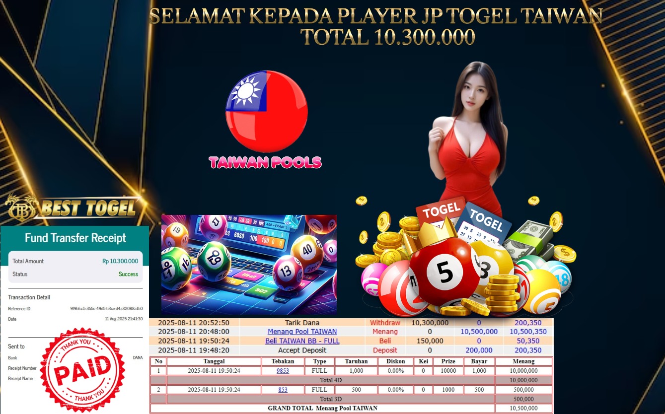 BUKTI JACKPOT TOGEL TAIWAN Rp. 10.300.000,00- LUNAS