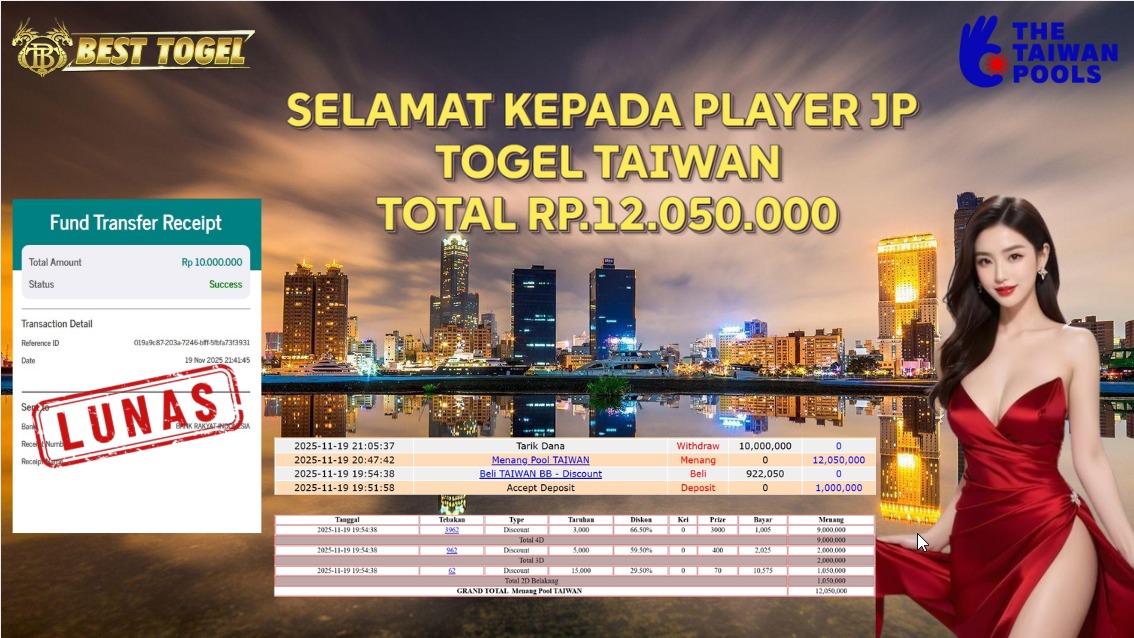 Selamat kepada User id : WAN****** Telah berhasil mendapatkan kemenangan besar pada permainan TOGEL TAIWAN dengan total kemenangan Sebesar Rp 12.050.000 ,- Setelah mengisi formulir withdraw dengan kurung waktu hanya 5 – 10 menit pihak BESTTOGEL sudah melakukan transfer kepada pemilik Userid dan dana sudah dapat di cairkan oleh pemenang. Bukti pembayaran yang kami berikan merupakan bukti pembayaran yang SAH / VALID yang langung di dapatkan melaui tanda transfer transaksi dari Bank yang di tuju.