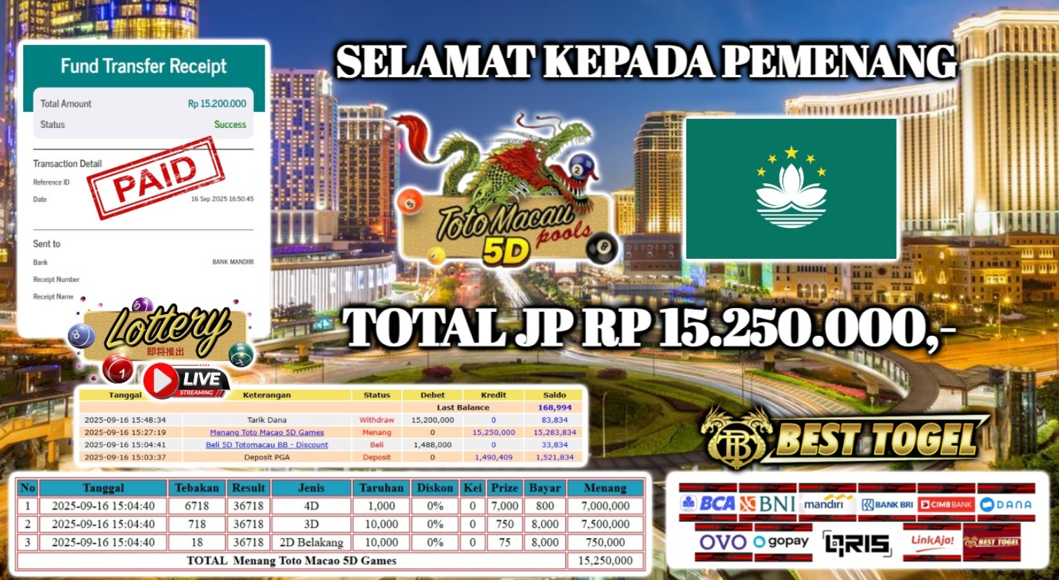 kepada User id : TRI ***** Telah berhasil mendapatkan kemenangan besar pada permainan TOGEL TOTO MACAO 5D GAMES dengan total kemenangan Sebesar Rp. 15.250.000,- Setelah mengisi formulir withdraw dengan kurung waktu hanya 5 – 10 menit pihak BESTTOGEL sudah melakukan transfer kepada pemilik Userid dan dana sudah dapat di cairkan oleh pemenang. Bukti pembayaran yang kami berikan merupakan bukti pembayaran yang SAH / VALID yang langung di dapatkan melaui tanda transfer transaksi dari Bank yang di tuju.
