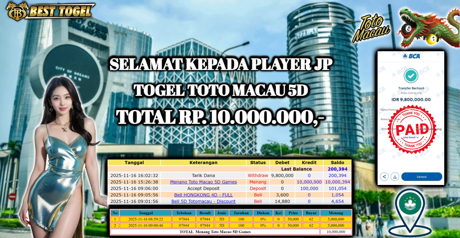 Selamat kepada User id :HOK****** Telah berhasil mendapatkan kemenangan besar pada permainan TOGEL TOTO MACAO 5D dengan total kemenangan Sebesar Rp 10.000.000 ,- Setelah mengisi formulir withdraw dengan kurung waktu hanya 5 – 10 menit pihak BESTTOGEL sudah melakukan transfer kepada pemilik Userid dan dana sudah dapat di cairkan oleh pemenang. Bukti pembayaran yang kami berikan merupakan bukti pembayaran yang SAH / VALID yang langung di dapatkan melaui tanda transfer transaksi dari Bank yang di tuju.