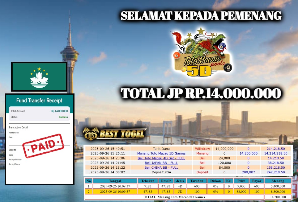 BUKTI JACKPOT TOGEL TOTO MACAU 5D MACAU Rp. 14.000.000,- LUNAS