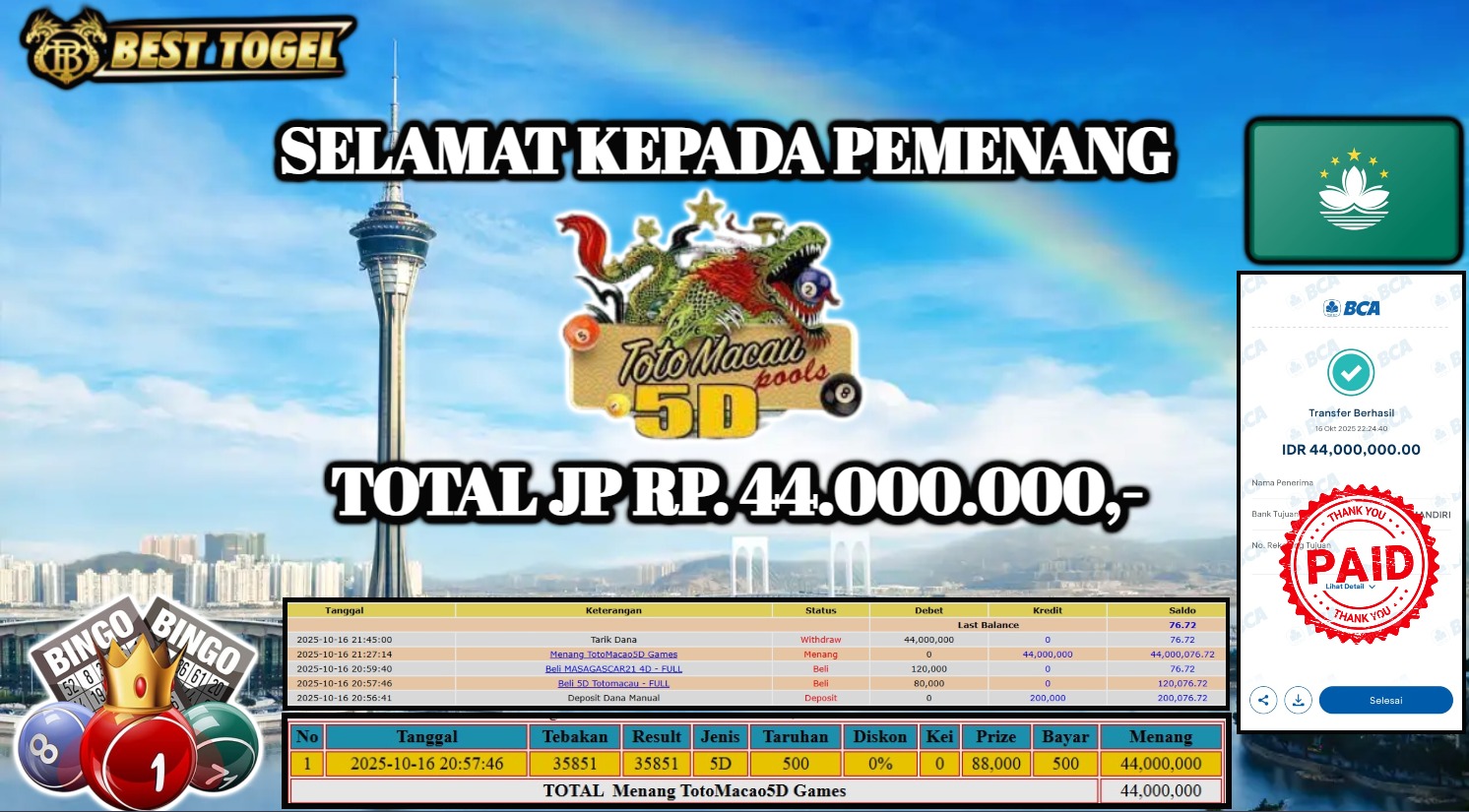 kepada User id : MIS****** Telah berhasil mendapatkan kemenangan besar pada permainan TOGEL TOTO MACAU 5D dengan total kemenangan Sebesar Rp. 44.000.000,- Setelah mengisi formulir withdraw dengan kurung waktu hanya 5 – 10 menit pihak BESTTOGEL sudah melakukan transfer kepada pemilik Userid dan dana sudah dapat di cairkan oleh pemenang. Bukti pembayaran yang kami berikan merupakan bukti pembayaran yang SAH / VALID yang langung di dapatkan melaui tanda transfer transaksi dari Bank yang di tuju.