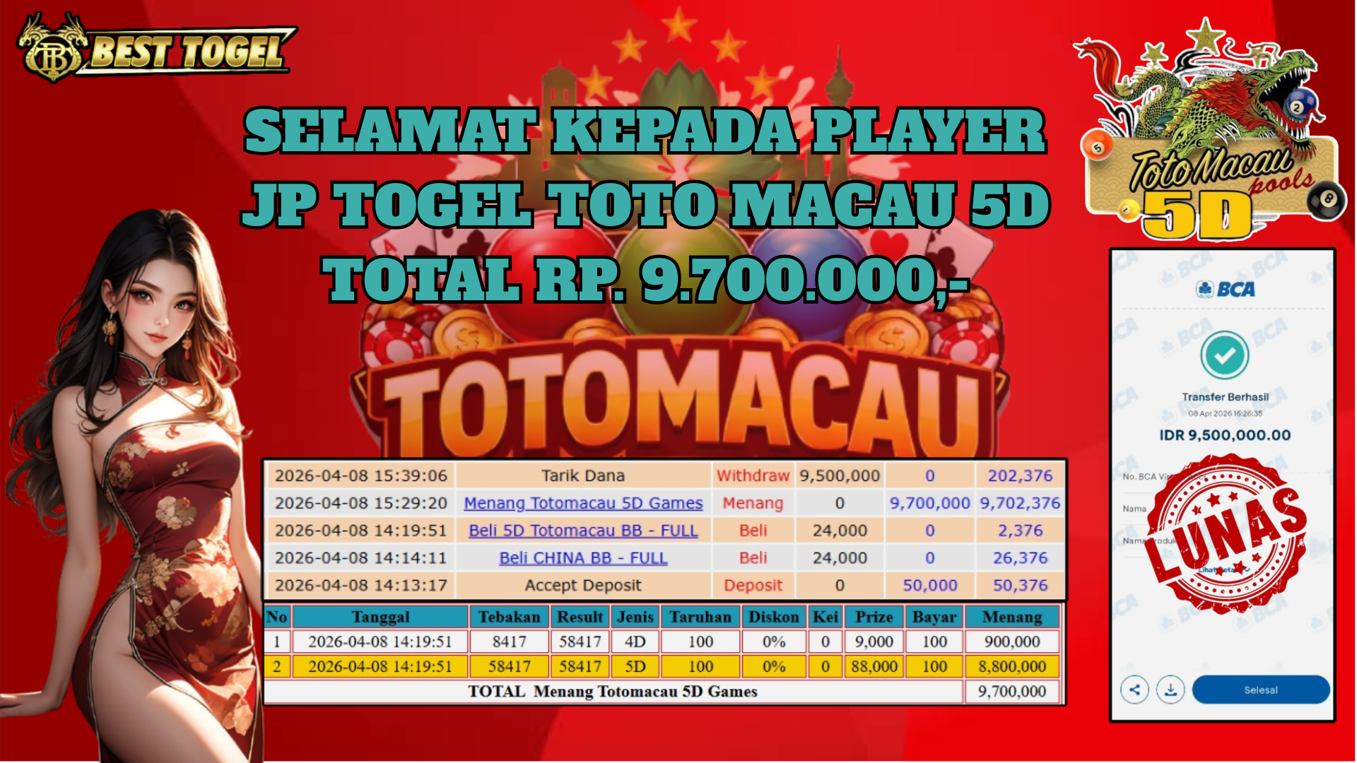 Selamat kepada User id : TEB*** Telah berhasil mendapatkan kemenangan besar pada permainanan TOGEL TOTO MACAU 5D dengan total kemenangan Sebesar Rp. 11,000,000,– Setelah mengisi formulir withdraw dengan kurung waktu hanya 5 – 10 menit pihak BESTTOGEL sudah melakukan transfer kepada pemilik Userid dan dana sudah dapat di cairkan oleh pemenang. Bukti pembayaran yang kami berikan merupakan bukti pembayaran yang SAH / VALID yang langung di dapatkan melaui tanda transfer transaksi dari Bank yang di tuju.Kami mengucapakan banyak Terima Kasih Kepada pemenang karena sudah mempercayakan kami sebagai Bandar Tepercaya yang membayar semua kemenangan member