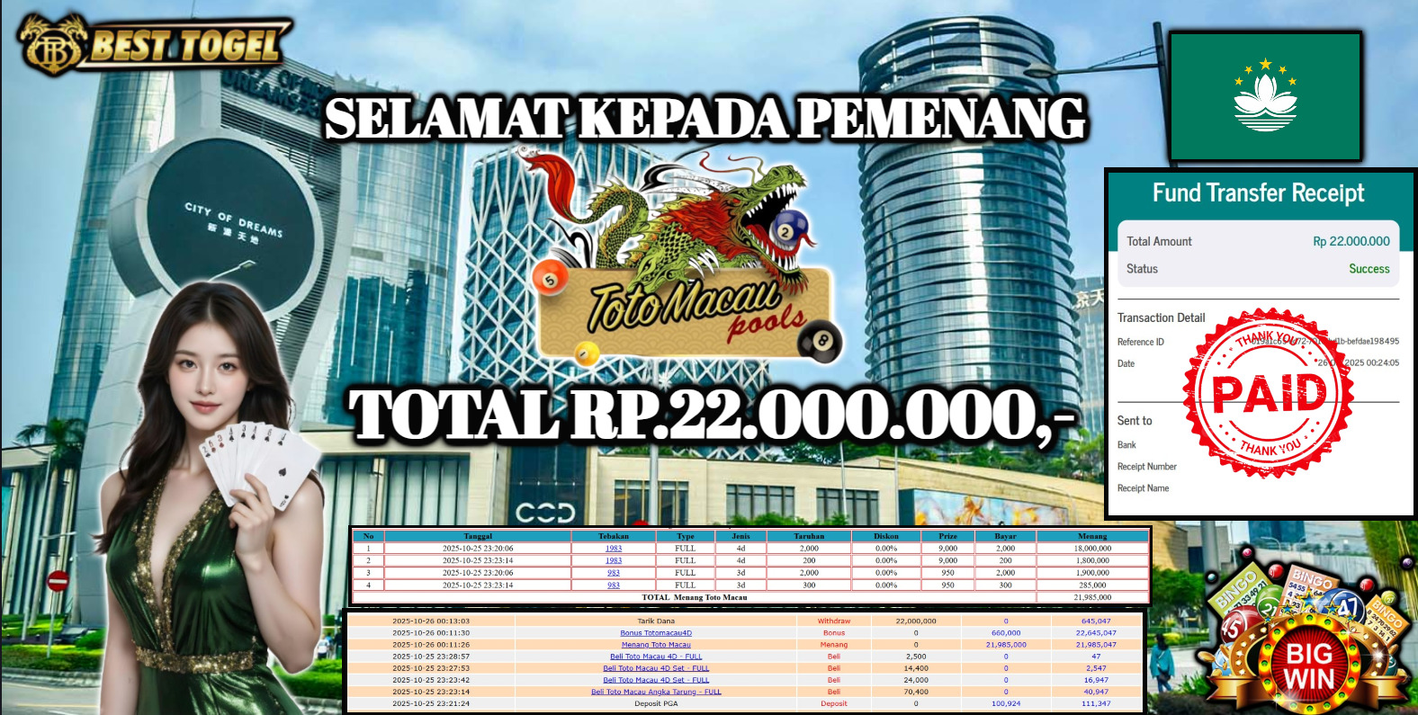 Selamat kepada User id : URS****** Telah berhasil mendapatkan kemenangan besar pada permainan TOGEL TOTO MACAU LOTTO dengan total kemenangan Sebesar Rp 22.000.000,- Setelah mengisi formulir withdraw dengan kurung waktu hanya 5 – 10 menit pihak BESTTOGEL sudah melakukan transfer kepada pemilik Userid dan dana sudah dapat di cairkan oleh pemenang. Bukti pembayaran yang kami berikan merupakan bukti pembayaran yang SAH / VALID yang langung di dapatkan melaui tanda transfer transaksi dari Bank yang di tuju.