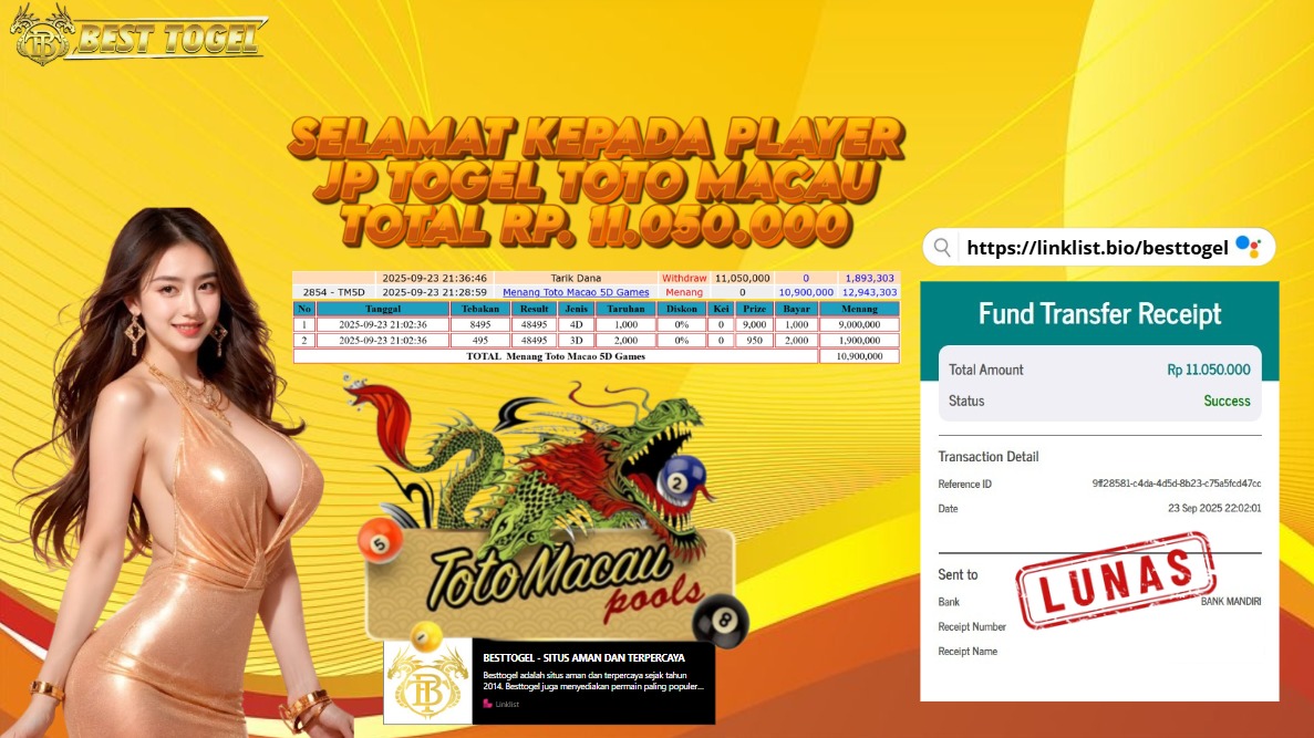 kepada User id : GFR****** Telah berhasil mendapatkan kemenangan besar pada permainan TOGEL TOTO MACAU dengan total kemenangan Sebesar Rp. 11.050.000,- Setelah mengisi formulir withdraw dengan kurung waktu hanya 5 – 10 menit pihak BESTTOGEL sudah melakukan transfer kepada pemilik Userid dan dana sudah dapat di cairkan oleh pemenang. Bukti pembayaran yang kami berikan merupakan bukti pembayaran yang SAH / VALID yang langung di dapatkan melaui tanda transfer transaksi dari Bank yang di tuju.