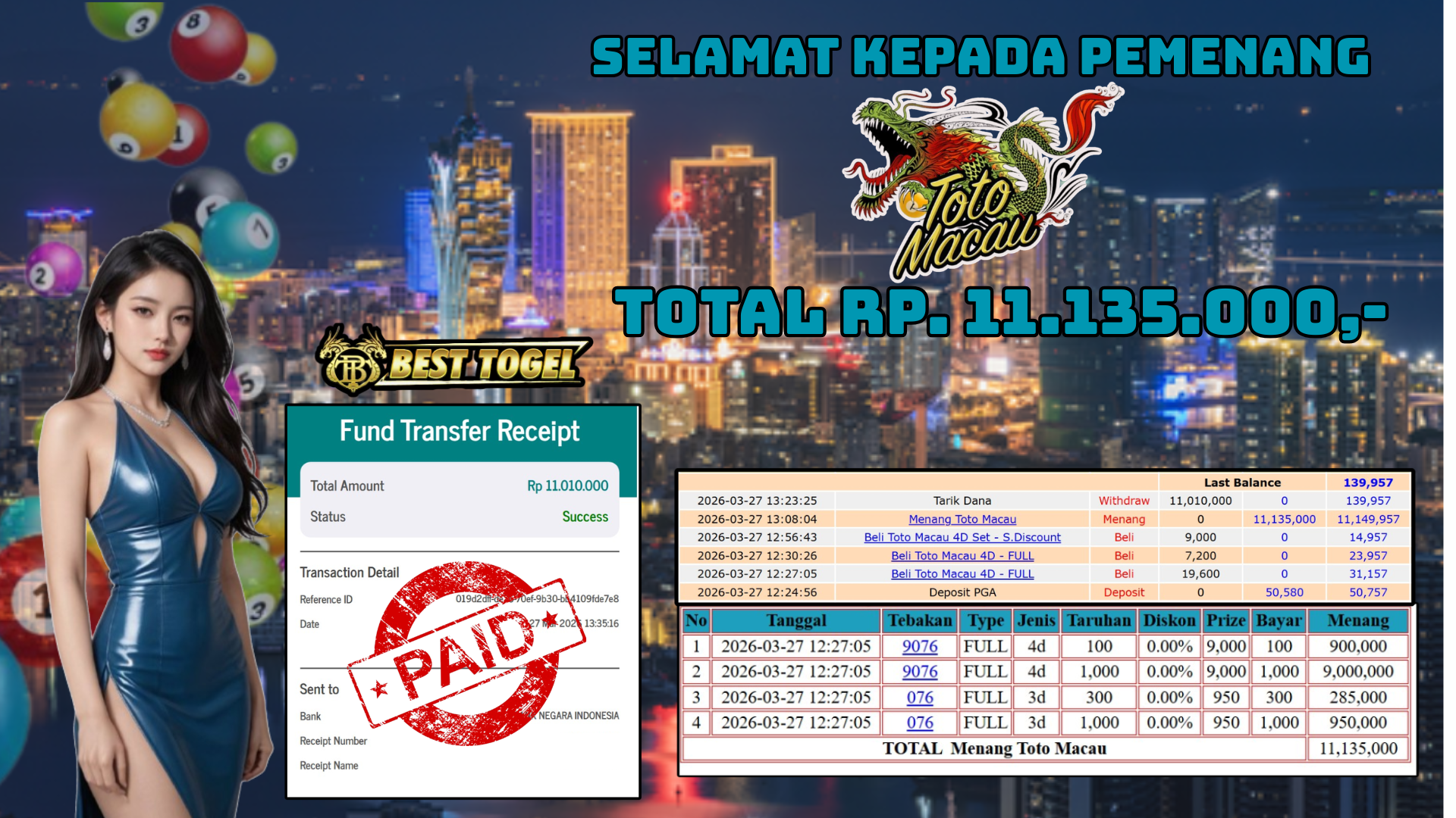 Selamat kepada User id : NRA****** Telah berhasil mendapatkan kemenangan besar pada permainan TOGEL TOTO MACAU dengan total kemenangan Sebesar Rp.11.135.000,– Setelah mengisi formulir withdraw dengan kurung waktu hanya 5 – 10 menit pihak BESTTOGEL sudah melakukan transfer kepada pemilik Userid dan dana sudah dapat di cairkan oleh pemenang. Bukti pembayaran yang kami berikan merupakan bukti pembayaran yang SAH / VALID yang langung di dapatkan melaui tanda transfer transaksi dari Bank yang di tuju.