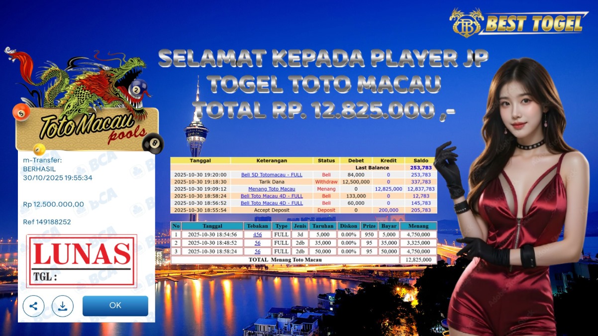 BUKTI JACKPOT TOGEL TOTO MACAU Rp. 12.825.000 ,- LUNAS