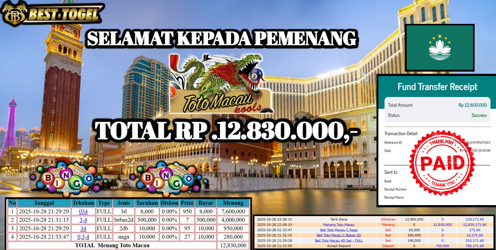 Selamat kepada User id : DHE****** Telah berhasil mendapatkan kemenangan besar pada permainan TOGEL TOTO MACAU dengan total kemenangan Sebesar Rp 12.830.000,- Setelah mengisi formulir withdraw dengan kurung waktu hanya 5 – 10 menit pihak BESTTOGEL sudah melakukan transfer kepada pemilik Userid dan dana sudah dapat di cairkan oleh pemenang. Bukti pembayaran yang kami berikan merupakan bukti pembayaran yang SAH / VALID yang langung di dapatkan melaui tanda transfer transaksi dari Bank yang di tuju.