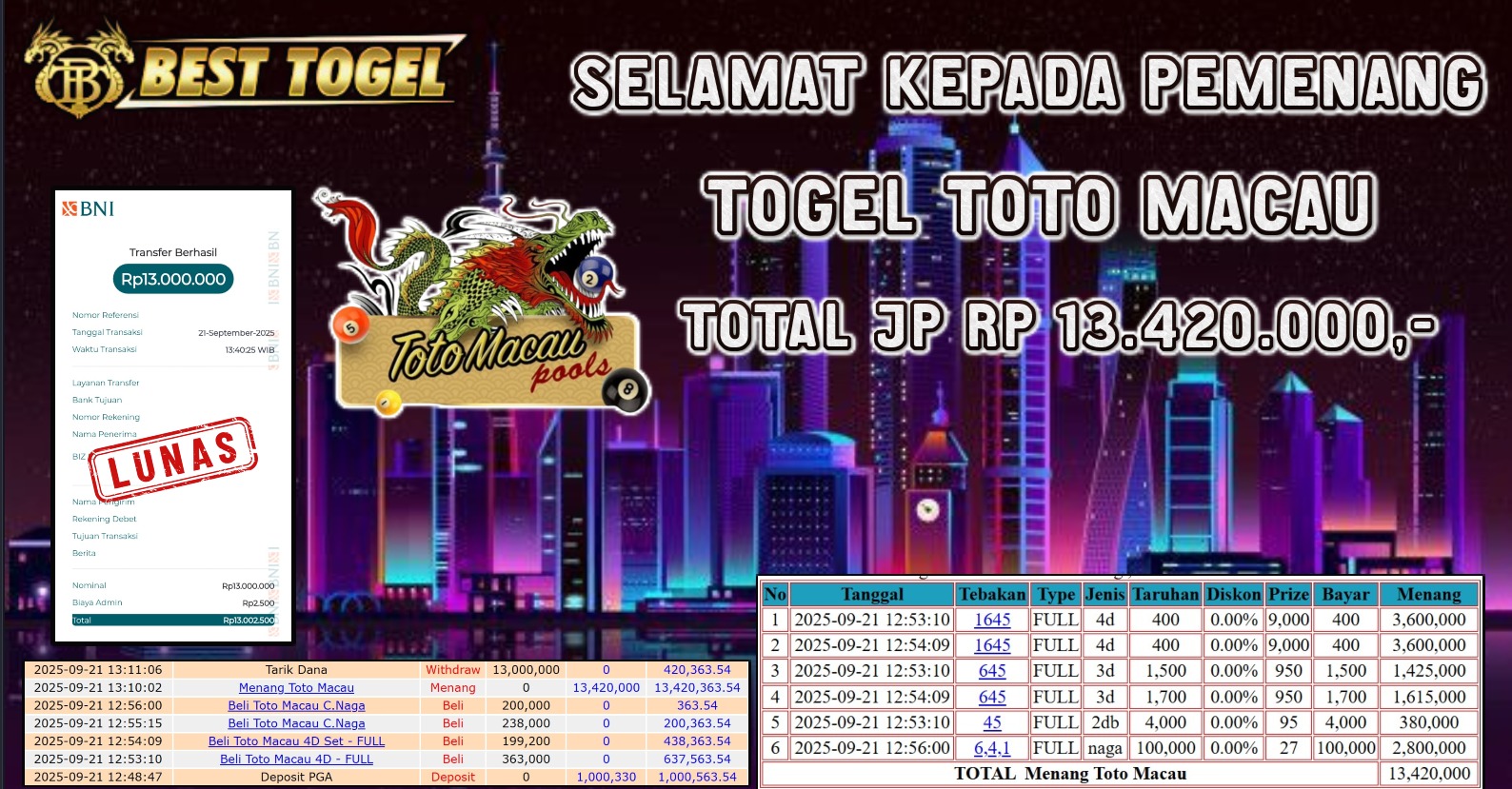 kepada User id : reb***** Telah berhasil mendapatkan kemenangan besar pada permainan TOGEL TOTO MACAU dengan total kemenangan Sebesar Rp. 13.420.000,- Setelah mengisi formulir withdraw dengan kurung waktu hanya 5 – 10 menit pihak BESTTOGEL sudah melakukan transfer kepada pemilik Userid dan dana sudah dapat di cairkan oleh pemenang. Bukti pembayaran yang kami berikan merupakan bukti pembayaran yang SAH / VALID yang langung di dapatkan melaui tanda transfer transaksi dari Bank yang di tuju.