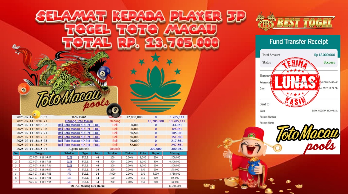 Selamat kepada User id : SM***** Telah berhasil mendapatkan kemenangan besar pada permainan TOGEL TOTO MACAU dengan total kemenangan Sebesar Rp 13.705.000,- Setelah mengisi formulir withdraw dengan kurung waktu hanya 5 – 10 menit pihak BESTTOGEL sudah melakukan transfer kepada pemilik Userid dan dana sudah dapat di cairkan oleh pemenang. Bukti pembayaran yang kami berikan merupakan bukti pembayaran yang SAH / VALID yang langung di dapatkan melaui tanda transfer transaksi dari Bank yang di tuju.