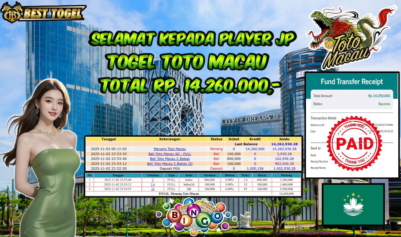 BUKTI JACKPOT TOGEL TOTO MACAU Rp. 14.260.000,- LUNAS