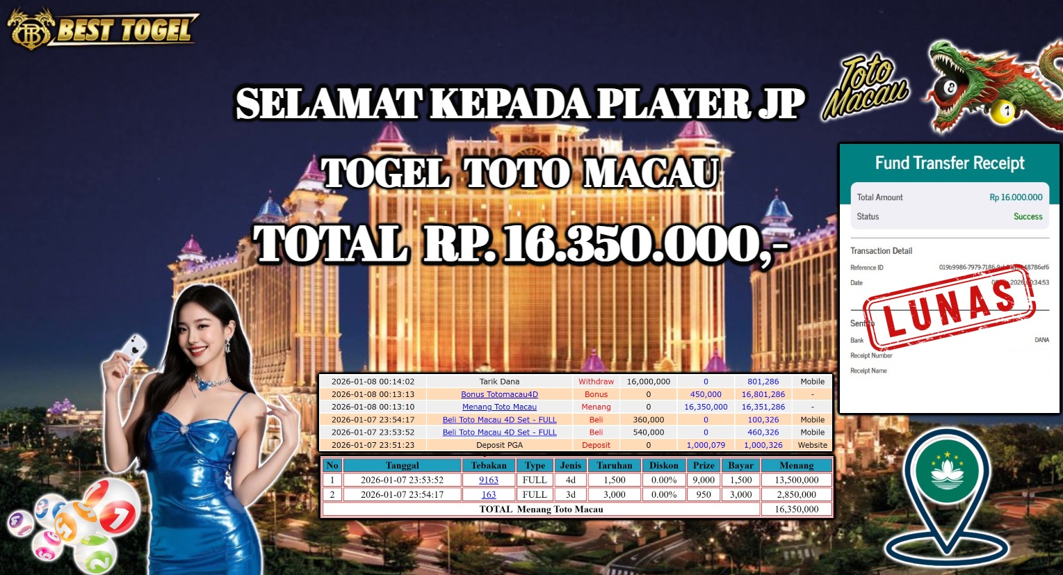 Selamat kepada User id : HOZ****** Telah berhasil mendapatkan kemenangan besar pada permainan TOGEL TOTO MACAU dengan total kemenangan Sebesar Rp.16.350.000– Setelah mengisi formulir withdraw dengan kurung waktu hanya 5 – 10 menit pihak BESTTOGEL sudah melakukan transfer kepada pemilik Userid dan dana sudah dapat di cairkan oleh pemenang. Bukti pembayaran yang kami berikan merupakan bukti pembayaran yang SAH / VALID yang langung di dapatkan melaui tanda transfer transaksi dari Bank yang di tuju.