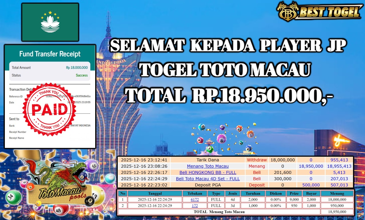 Selamat kepada User id : JAK****** Telah berhasil mendapatkan kemenangan besar pada permainan TOGEL TOTO MACAU dengan total kemenangan Sebesar Rp. 18.950.000 ,- Setelah mengisi formulir withdraw dengan kurung waktu hanya 5 – 10 menit pihak BESTTOGEL sudah melakukan transfer kepada pemilik Userid dan dana sudah dapat di cairkan oleh pemenang. Bukti pembayaran yang kami berikan merupakan bukti pembayaran yang SAH / VALID yang langung di dapatkan melaui tanda transfer transaksi dari Bank yang di tuju.