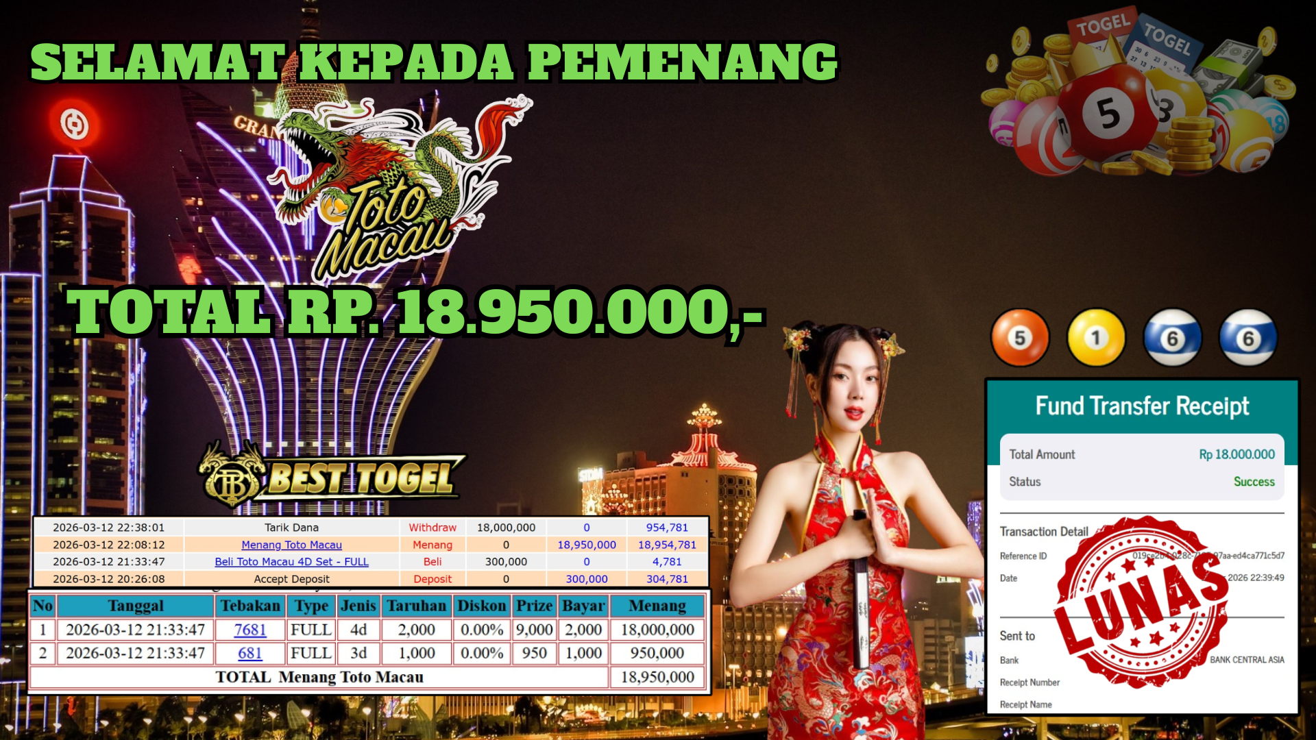 Selamat kepada User id : QUS****** Telah berhasil mendapatkan kemenangan besar pada permainan TOGEL TOTO MACAU dengan total kemenangan Sebesar Rp. 18.950.000,– Setelah mengisi formulir withdraw dengan kurung waktu hanya 5 – 10 menit pihak BESTTOGEL sudah melakukan transfer kepada pemilik Userid dan dana sudah dapat di cairkan oleh pemenang. Bukti pembayaran yang kami berikan merupakan bukti pembayaran yang SAH / VALID yang langung di dapatkan melaui tanda transfer transaksi dari Bank yang di tuju.