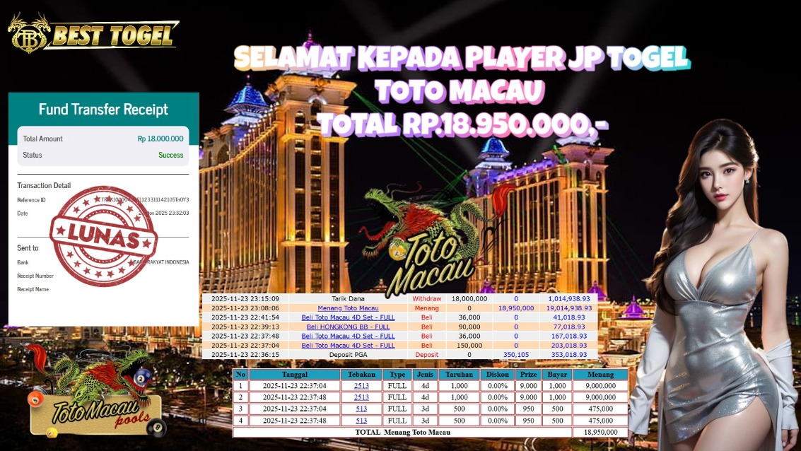 Selamat kepada User id : FR6****** Telah berhasil mendapatkan kemenangan besar pada permainan TOGEL TOTO MACAU dengan total kemenangan Sebesar Rp 18.950.000 ,- Setelah mengisi formulir withdraw dengan kurung waktu hanya 5 – 10 menit pihak BESTTOGEL sudah melakukan transfer kepada pemilik Userid dan dana sudah dapat di cairkan oleh pemenang. Bukti pembayaran yang kami berikan merupakan bukti pembayaran yang SAH / VALID yang langung di dapatkan melaui tanda transfer transaksi dari Bank yang di tuju.