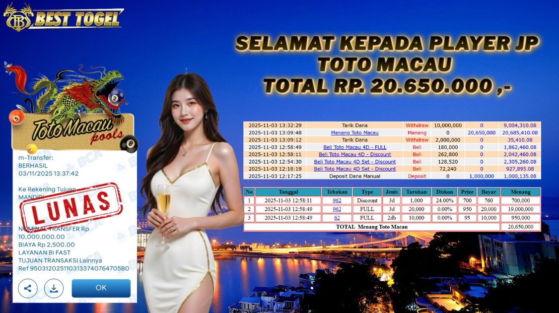 Selamat kepada User id : JP2****** Telah berhasil mendapatkan kemenangan besar pada permainan TOGEL TOTO MACAU dengan total kemenangan Sebesar Rp 20.650.000,- Setelah mengisi formulir withdraw dengan kurung waktu hanya 5 – 10 menit pihak BESTTOGEL sudah melakukan transfer kepada pemilik Userid dan dana sudah dapat di cairkan oleh pemenang. Bukti pembayaran yang kami berikan merupakan bukti pembayaran yang SAH / VALID yang langung di dapatkan melaui tanda transfer transaksi dari Bank yang di tuju.