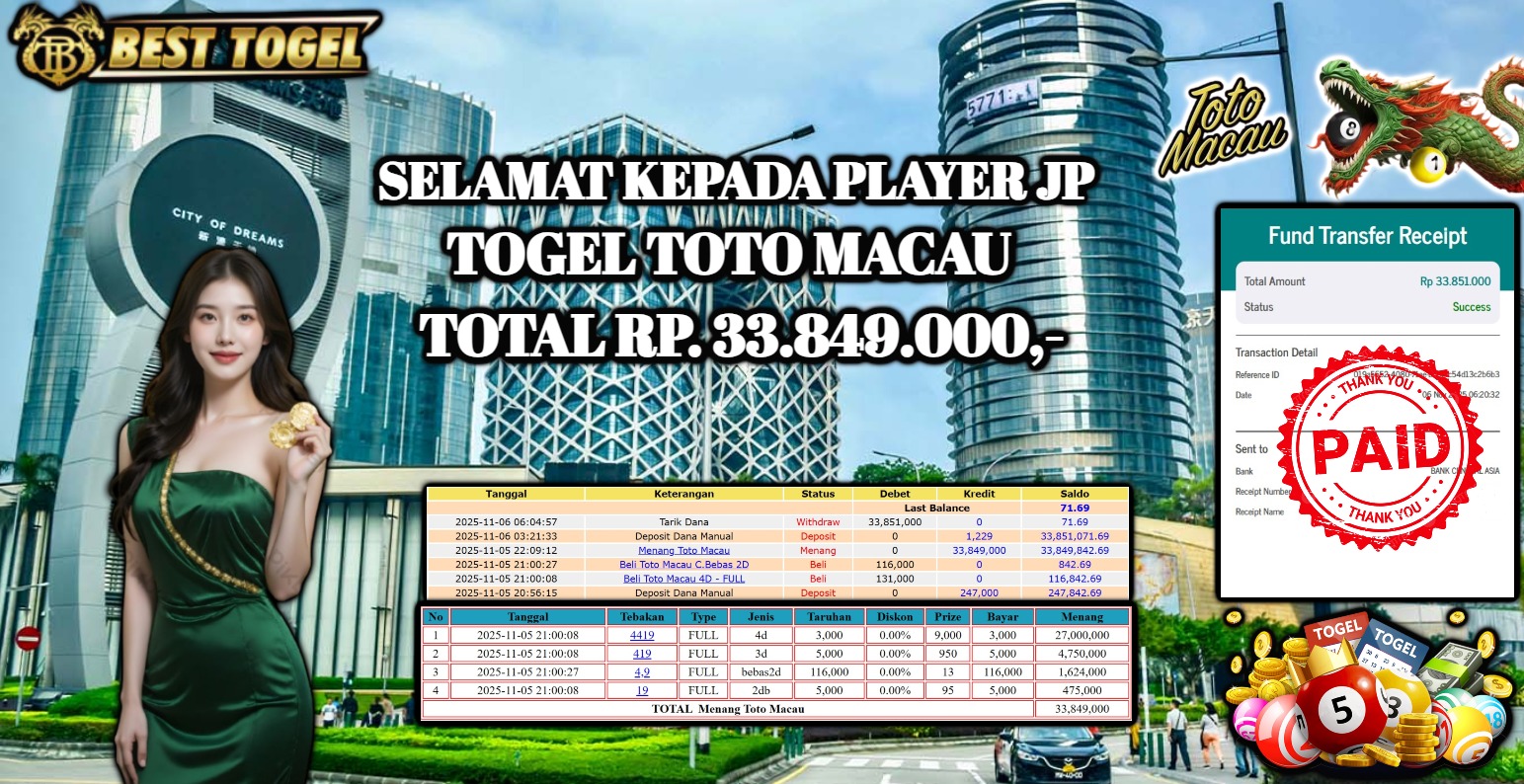 Selamat kepada User id : SMR****** Telah berhasil mendapatkan kemenangan besar pada permainan TOGEL TOTO MACAU dengan total kemenangan Sebesar Rp 33.849.000,- Setelah mengisi formulir withdraw dengan kurung waktu hanya 5 – 10 menit pihak BESTTOGEL sudah melakukan transfer kepada pemilik Userid dan dana sudah dapat di cairkan oleh pemenang. Bukti pembayaran yang kami berikan merupakan bukti pembayaran yang SAH / VALID yang langung di dapatkan melaui tanda transfer transaksi dari Bank yang di tuju.