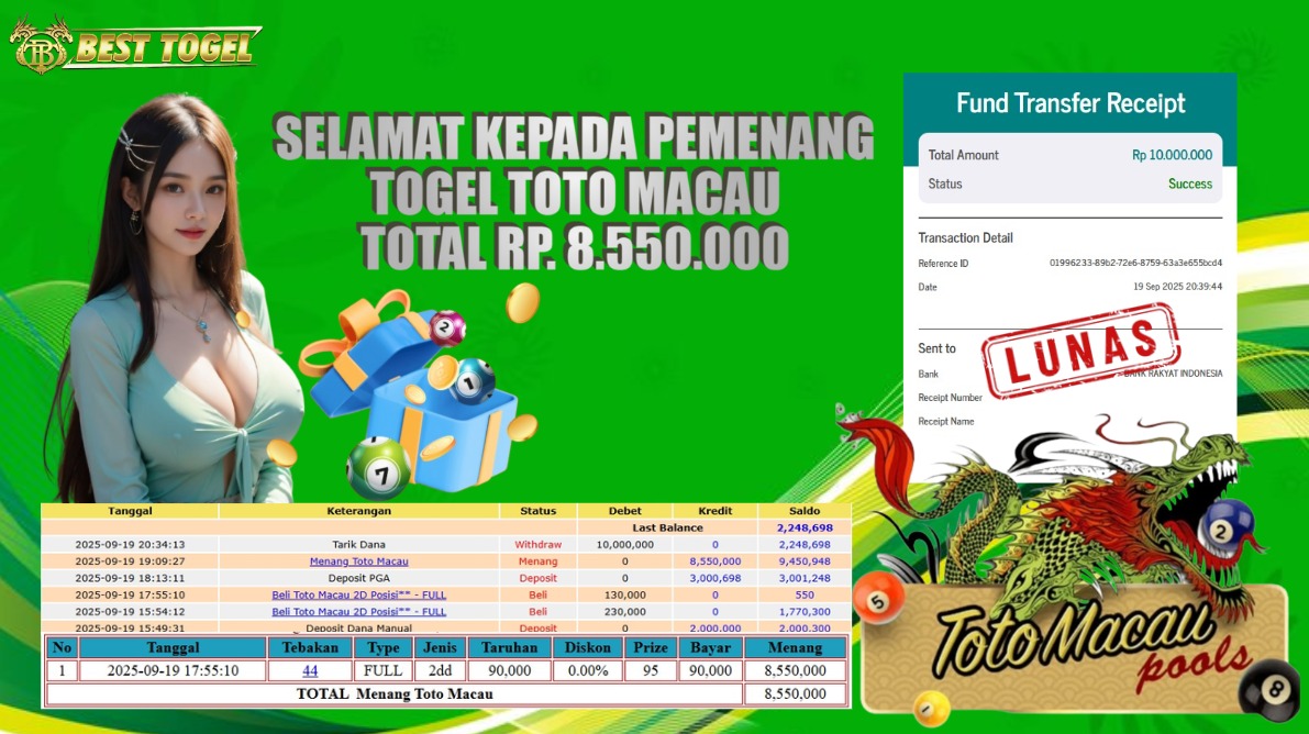 kepada User id : ABF***** Telah berhasil mendapatkan kemenangan besar pada permainan TOGEL TOTO MACAU dengan total kemenangan Sebesar Rp. 8.550.000,- Setelah mengisi formulir withdraw dengan kurung waktu hanya 5 – 10 menit pihak BESTTOGEL sudah melakukan transfer kepada pemilik Userid dan dana sudah dapat di cairkan oleh pemenang. Bukti pembayaran yang kami berikan merupakan bukti pembayaran yang SAH / VALID yang langung di dapatkan melaui tanda transfer transaksi dari Bank yang di tuju.