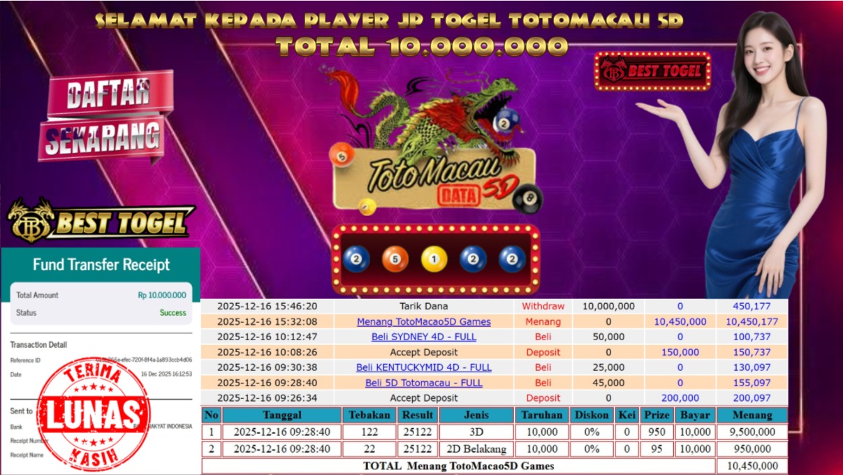 BUKTI JACKPOT TOGEL TOTOMACAU 5D RP.10.000.000- LUNAS